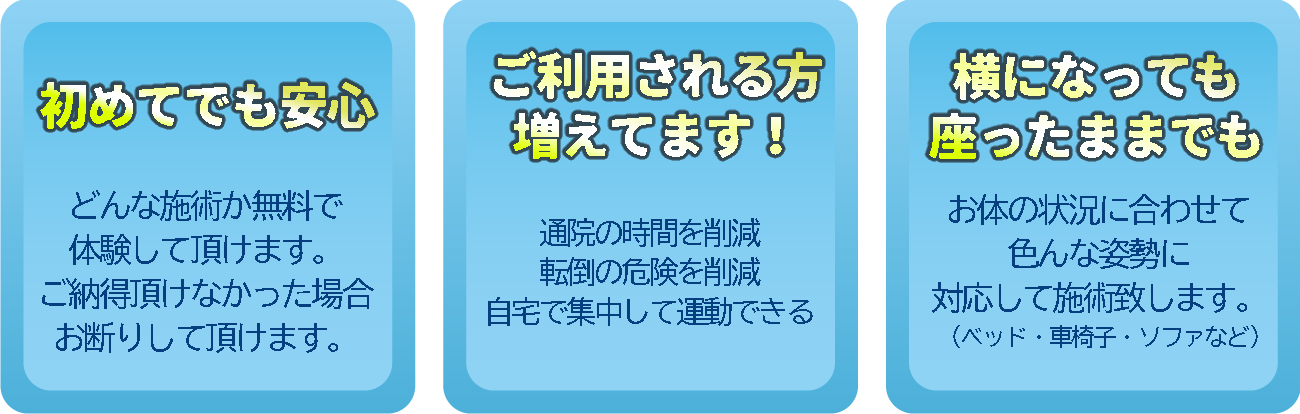 無料体験当日は、お体の状況や痛みの程度、今までにどんな病気になったことがあか、いまどんなお薬を飲んでおられるかなどをお伺いします。お話が終わったら施術を体験して頂きます。体験後、料金やお支払い、施術スタートまでのお手続きについてご説明させて頂きます。